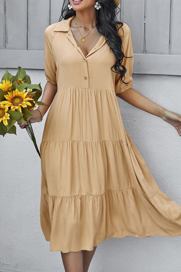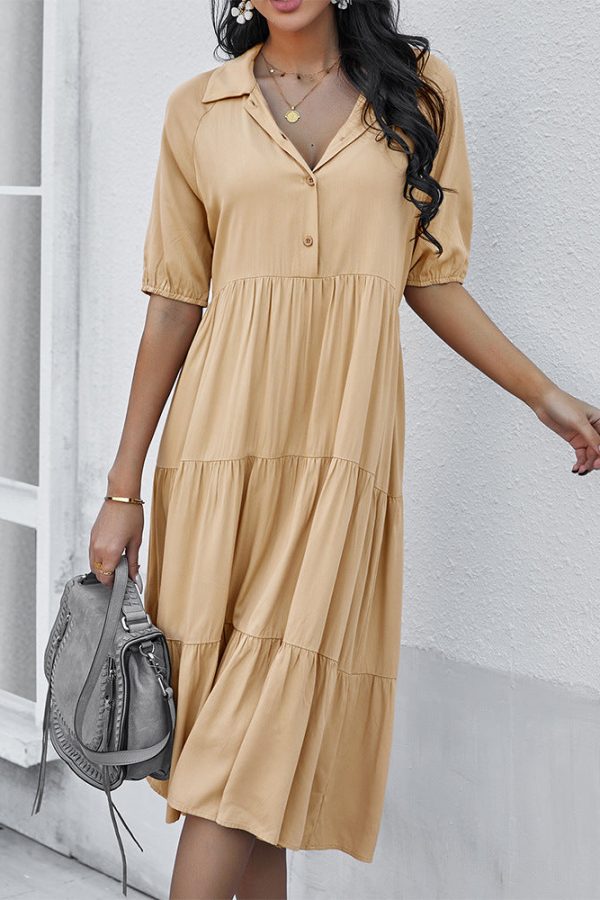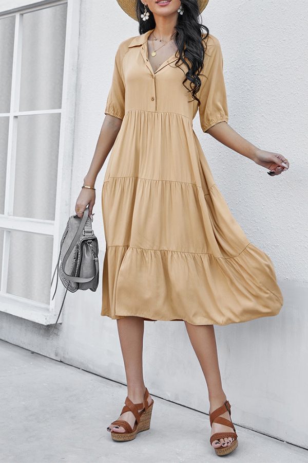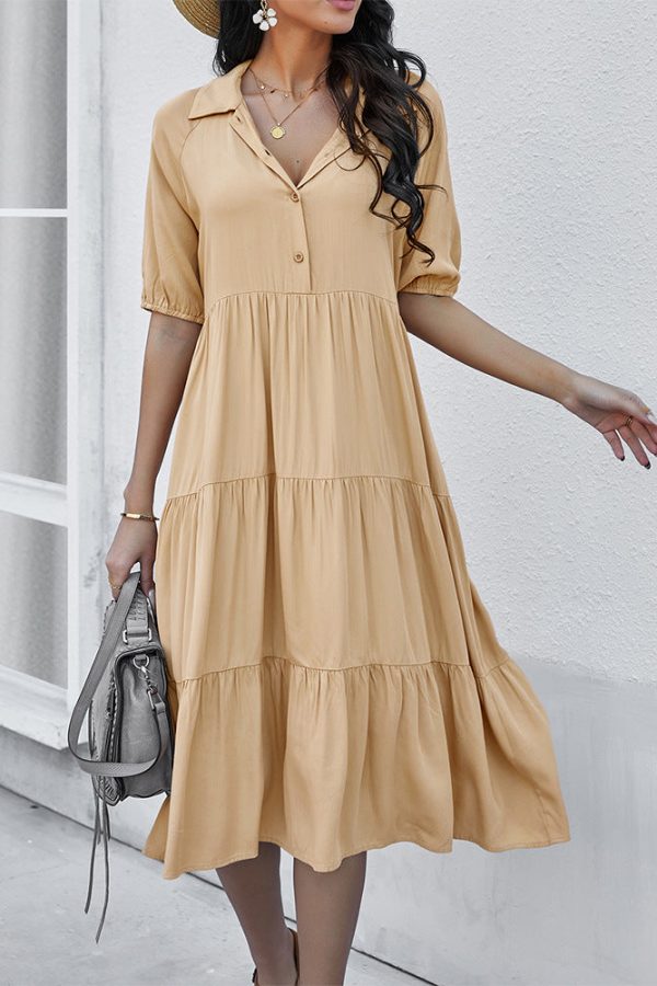 Fashionable Women Summer V Neck Short Sleeve Solid Color High Waist Casual Resort Swing Loose Long Dress