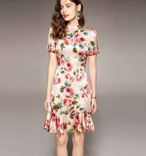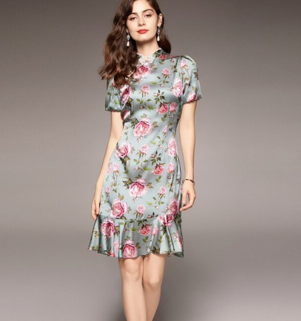 100% Natural Silk Women’s Dresses Vintage Stand Collar Short Sleeves Floral Printed Ruffles Elegant Dress Vestidos