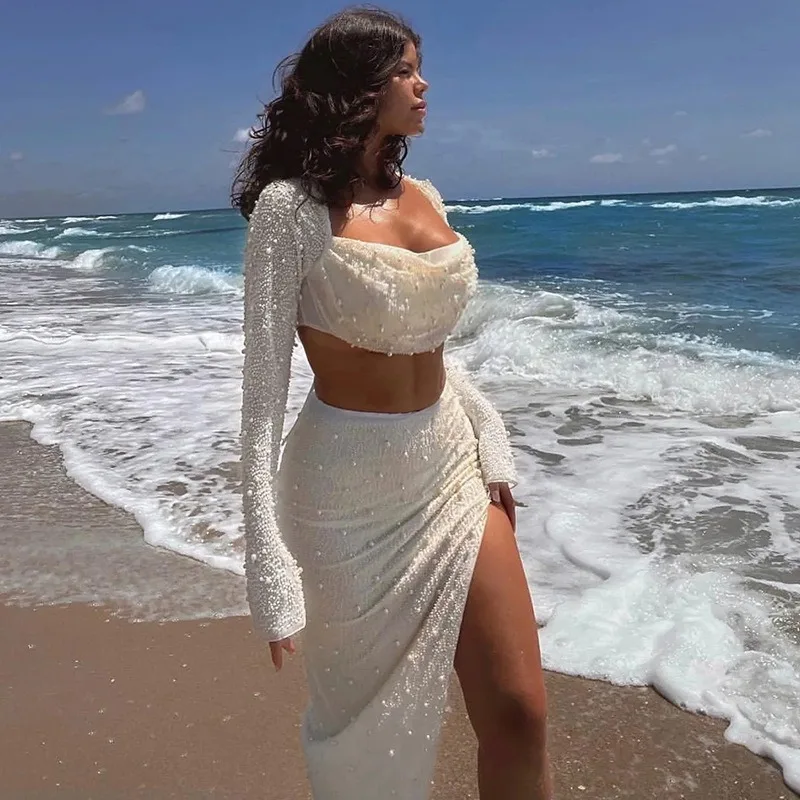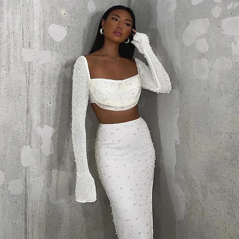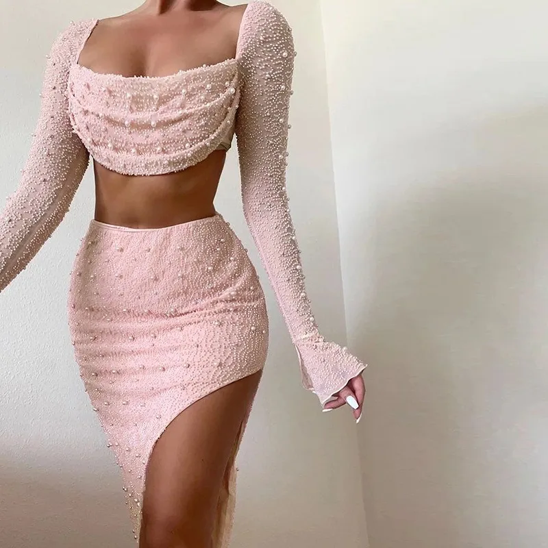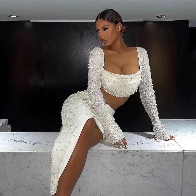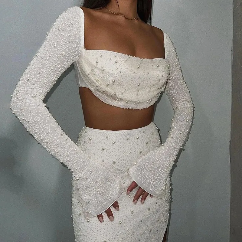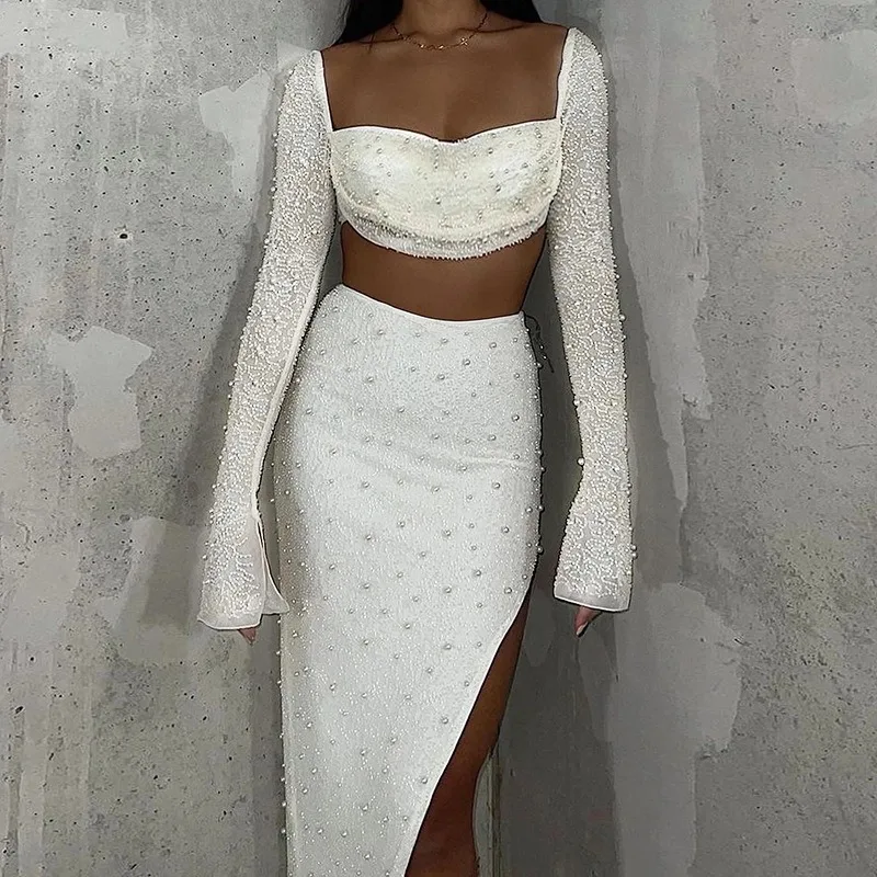 2 Pieces Set Pearl Rhinestone Women Long Sleeve Backless Crop Tops Split Midi Skirts
