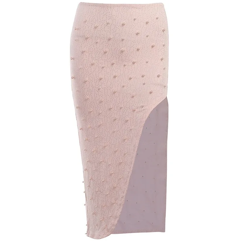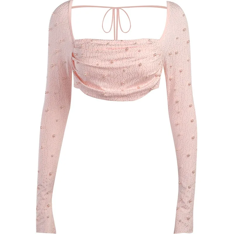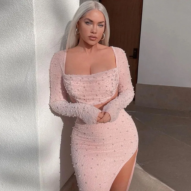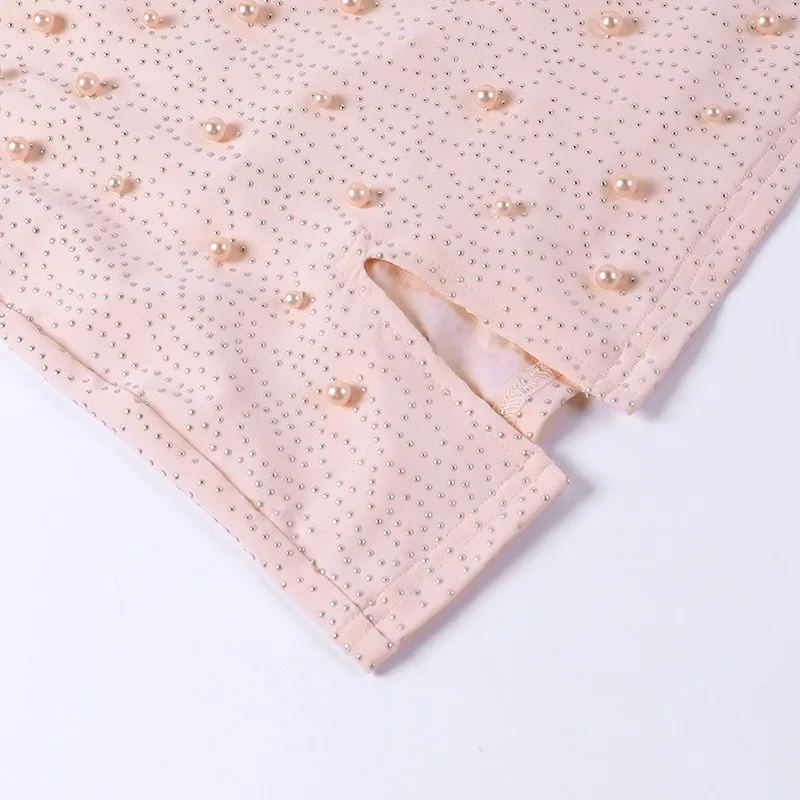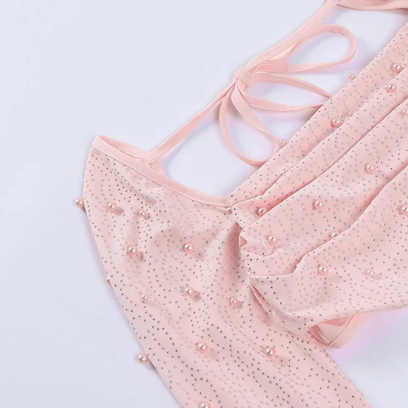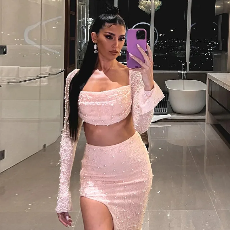 2 Pieces Set Pearl Rhinestone Women Long Sleeve Backless Crop Tops Split Midi Skirts