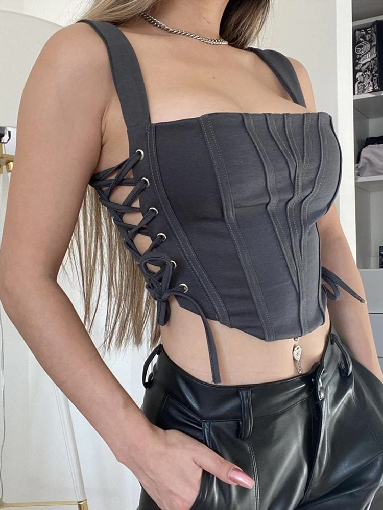 Street Hollow Side Tie-Up Tank Top Corset Bustier Women Sleeveless Low Cut Bandage Crop Top